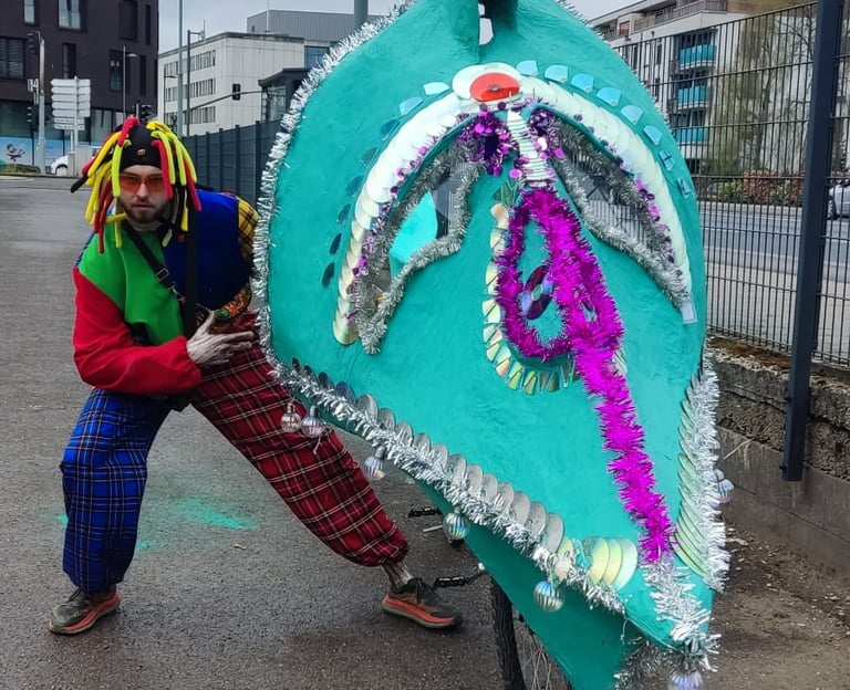 Lors de la NDLC d’avril 2023 la vélorution a organisé la 10e édition de son rassemblement. Pour celui-ci j’ai été demandé en tant qu'artiste de créer des Vélos “tape à l’oeil” originaux censés promouvoir le Vélo. Il en est sorti 6 vélos originaux ; le drumbike, Jellybike, Aerobike, Invisibike, Sharkbike et le majestueux Nautilus faits de bois, clôture à poule et papier mâché.